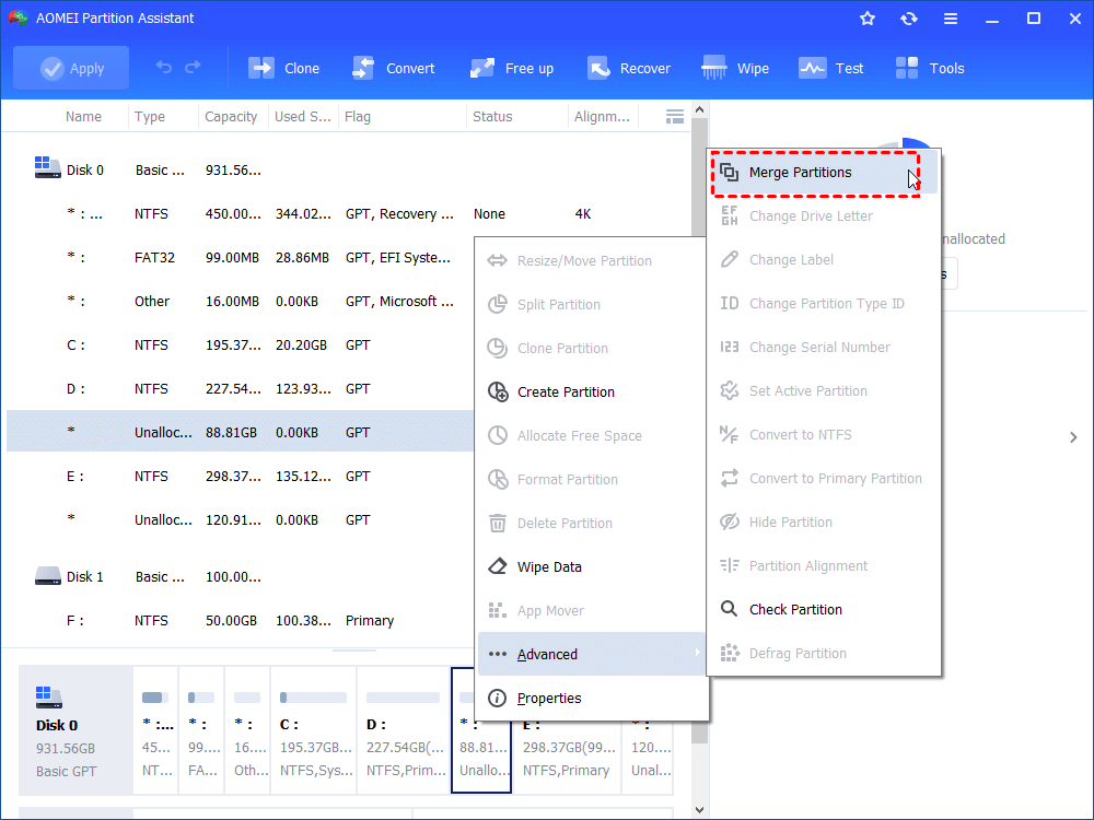 Here we recommend the “Merge Partitions” feature of the AOMEI Partition Assistant for this situation. This function merges two close or continuous unallocated slots into a single partition.