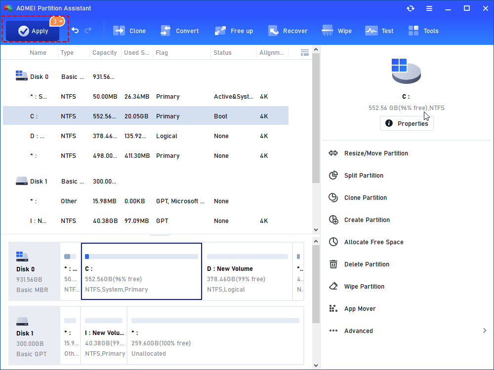 Step 3. Now you can preview that some free space has been allocated to C drive from D partition. Click Apply to save the changes. Then you will extend partition C.