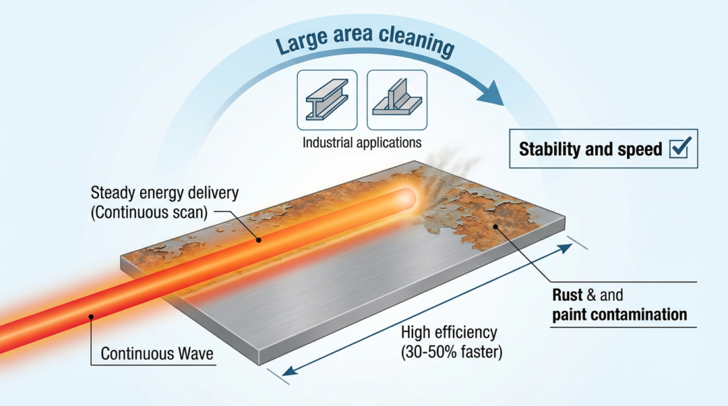 Continuous laser is more about steady output. In large-area work, heavy contamination, and efficiency-focused applications, it often has more advantage. Common uses include: