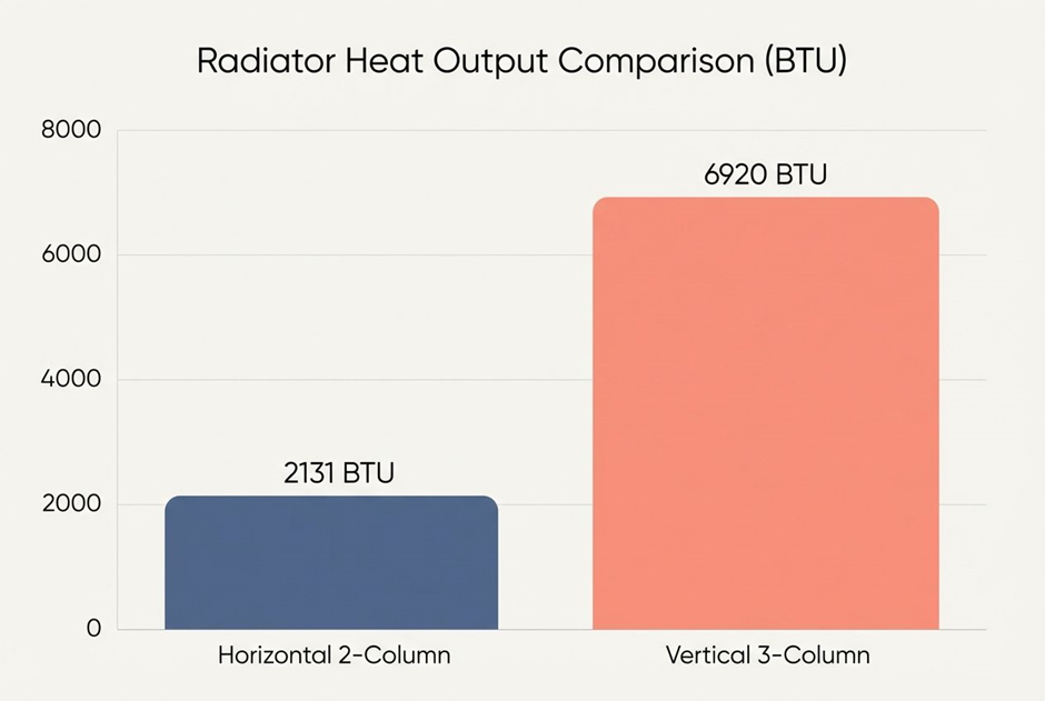 - A real-world sizing reference: a 600mm x 605mm horizontal 2-column model is commonly listed at 2131 BTU (625 W), while an 1800mm x 560mm vertical 3-column model can reach 6920 BTU (2028 W).